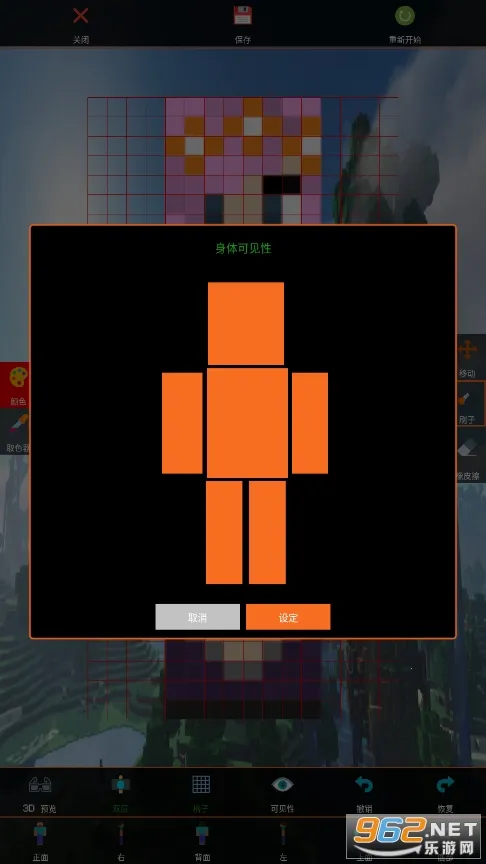 上方栏框中则代表取消编辑,以及选择编辑的部位。编辑底层皮肤或是第2层皮肤。以及确认保存的功能。