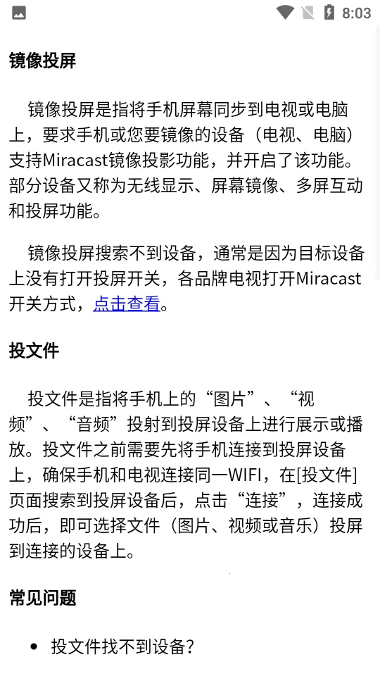 1. 连接方式多样,支持手机扫码投屏、投屏码投屏以及同WiFi搜索投屏等,操作便捷。