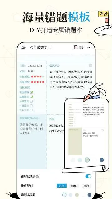 布抄2025是一款专注错题整理的电子错题本软件。支持拍照识别录入错题,能自动擦除笔迹还原试卷,可错题组卷打印练习,还有错题本DIY、试卷共享等功能,助力学生高效学习,家长轻松辅导。