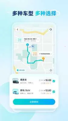 1. 一键呼叫服务,选择上下车点后系统自动规划行程并预估费用,还能选轿车、SUV 或商务车等车型。