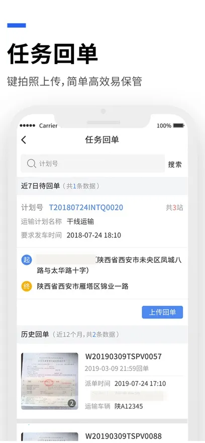 4. 支持一键拍照上传回单,简单高效易保管,还有司机画像、未执行任务等特色功能。