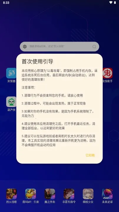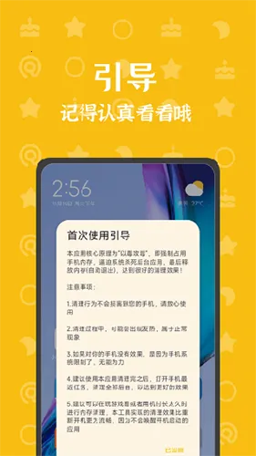 1. 它采用创新的以毒攻毒清理方式,强制占用手机内存,迫使系统自动关闭后台不必要进程,释放大量内存空间,让手机运行更流畅,比传统方式高效,还避免重启不便。