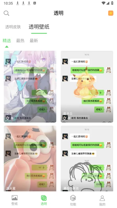 3. 具有多种特色功能。支持将微信、QQ 等应用设置透明壁纸,本地相册图片也能设为透明或动态壁纸,还新增一键发布、点赞和分享功能。