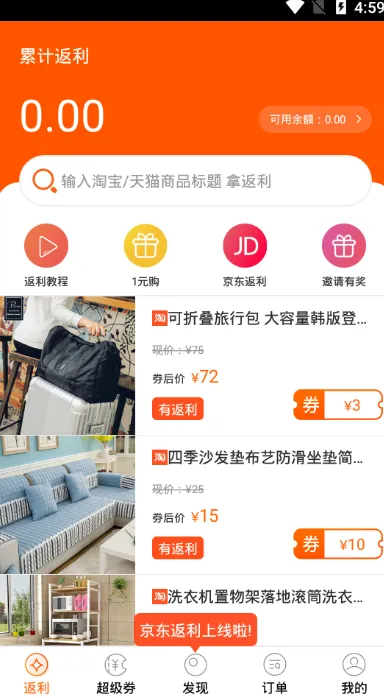 2. 返利栏目设置贴心,不仅提供返利流程教学,还有京东返利通道、邀请奖励及商城返利入口,方便用户操作。