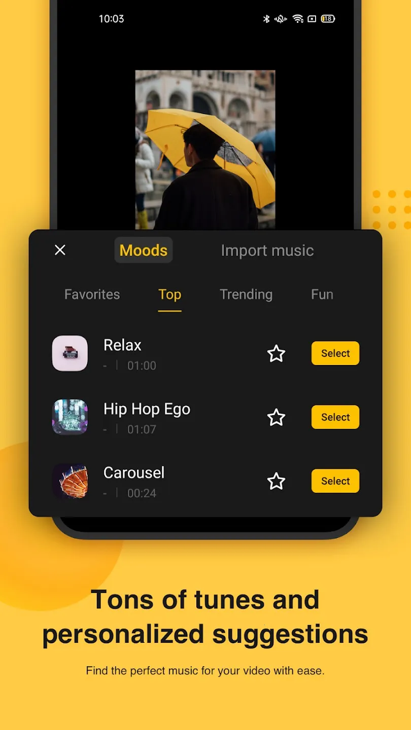 2. 海量曲库资源丰富,能自由添加喜欢的背景音乐,用于剪辑制作不同视频。