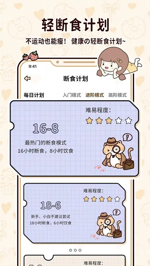 喵喵轻断食是一款永久免费的轻断食APP,画风可爱。能定制专属计划,涵盖多种断食方案,实时跟踪每餐热量,记录饮食运动饮水等数据,可视化呈现变化,助你健康减重。