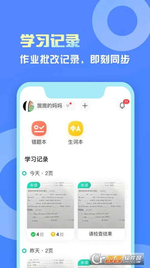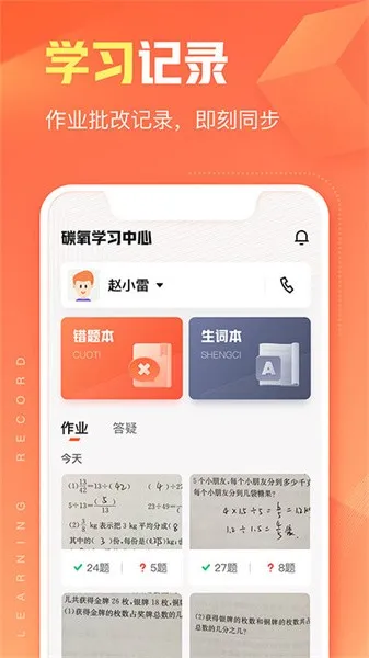 2、学习记录同步,孩子的学习记录如答疑、交作业、搜题批改等情况,能即刻同步到App,让家长对孩子学习情况一目了然。