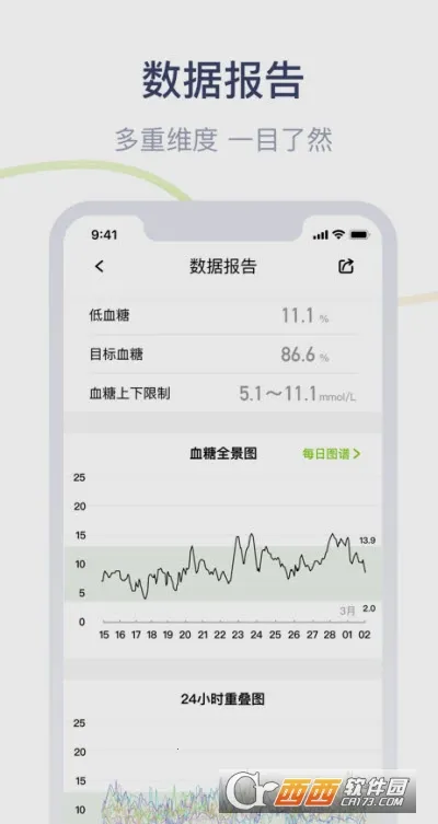 2、 数据报告功能可查看报告,如目标范围内的时间、血糖全景图、24 小时重叠图、高低血糖区域图等,并可一键分享。