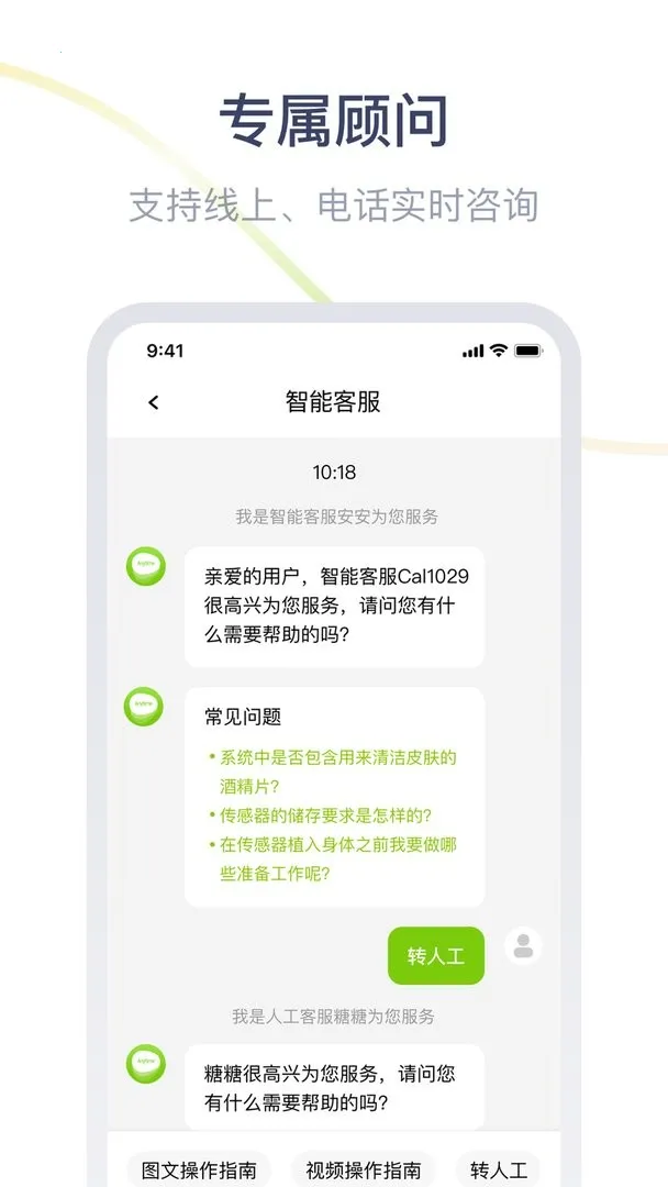 3、提供在线咨询和电话咨询两种方式,产品顾问解答佩戴和使用问题。高低血糖提醒方式多样,可按自身需求设置,如系统消息弹框、语音播报等。