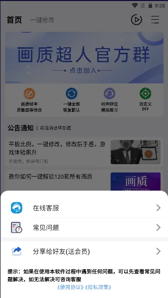 超人画质助手是一款面向吃鸡手游的画质提升软件,支持和平精英等多游戏。能解锁高帧数与极限画质,可自定义画质、音质、灵敏度等,操作简单,无需root,还修复了已知问题 。