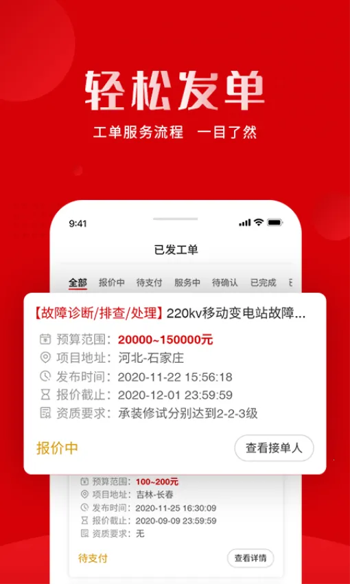 3. 自动保存已发工单的信息,并按报价、待支付、服务中、待确认等分类展示。