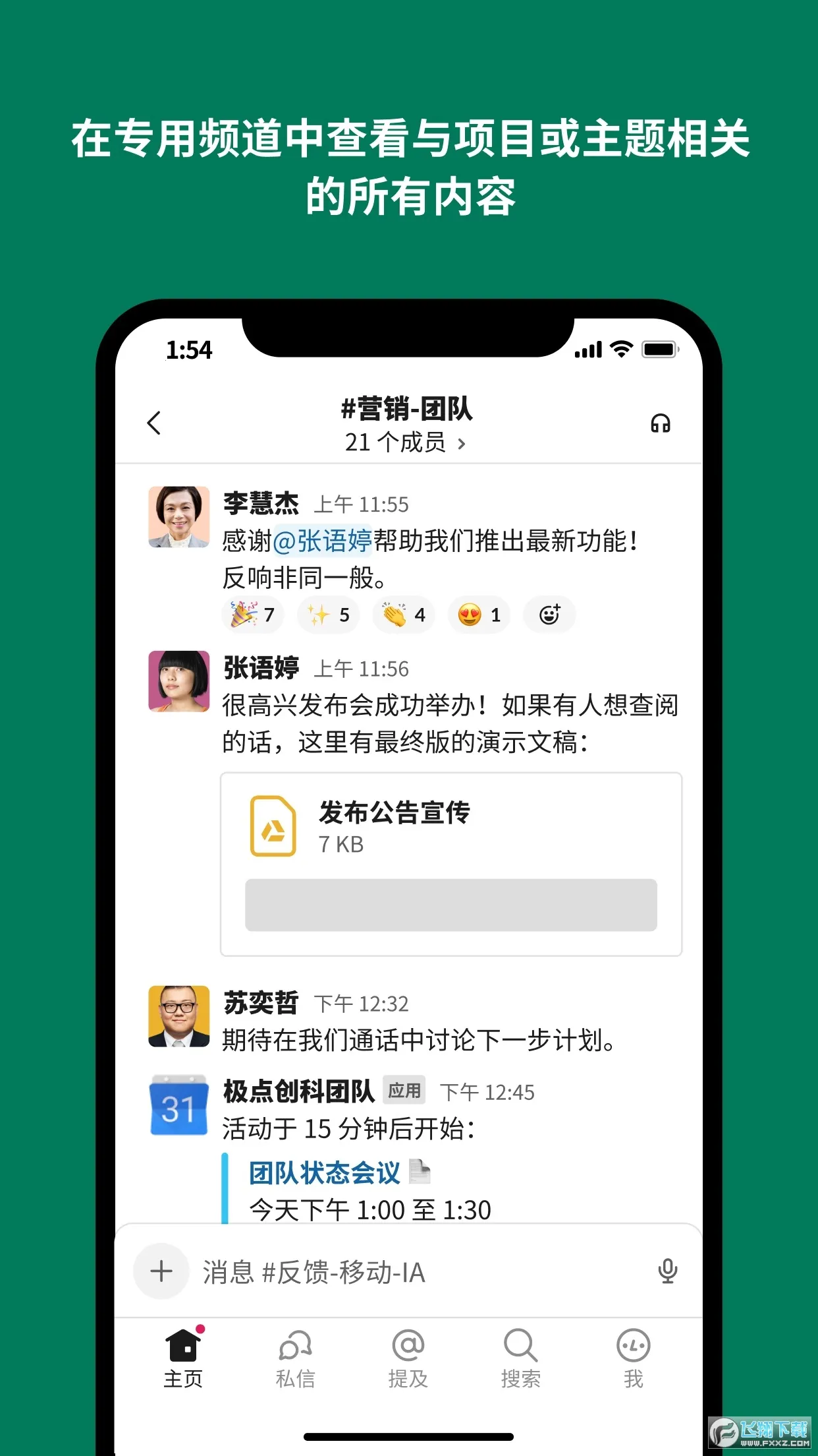 4. 提供专用频道,关注各个主题、项目或团队相关内容,通过共享频道能与客户、供应商或合作伙伴保持联系,以更快的对话速度提升工作效率。