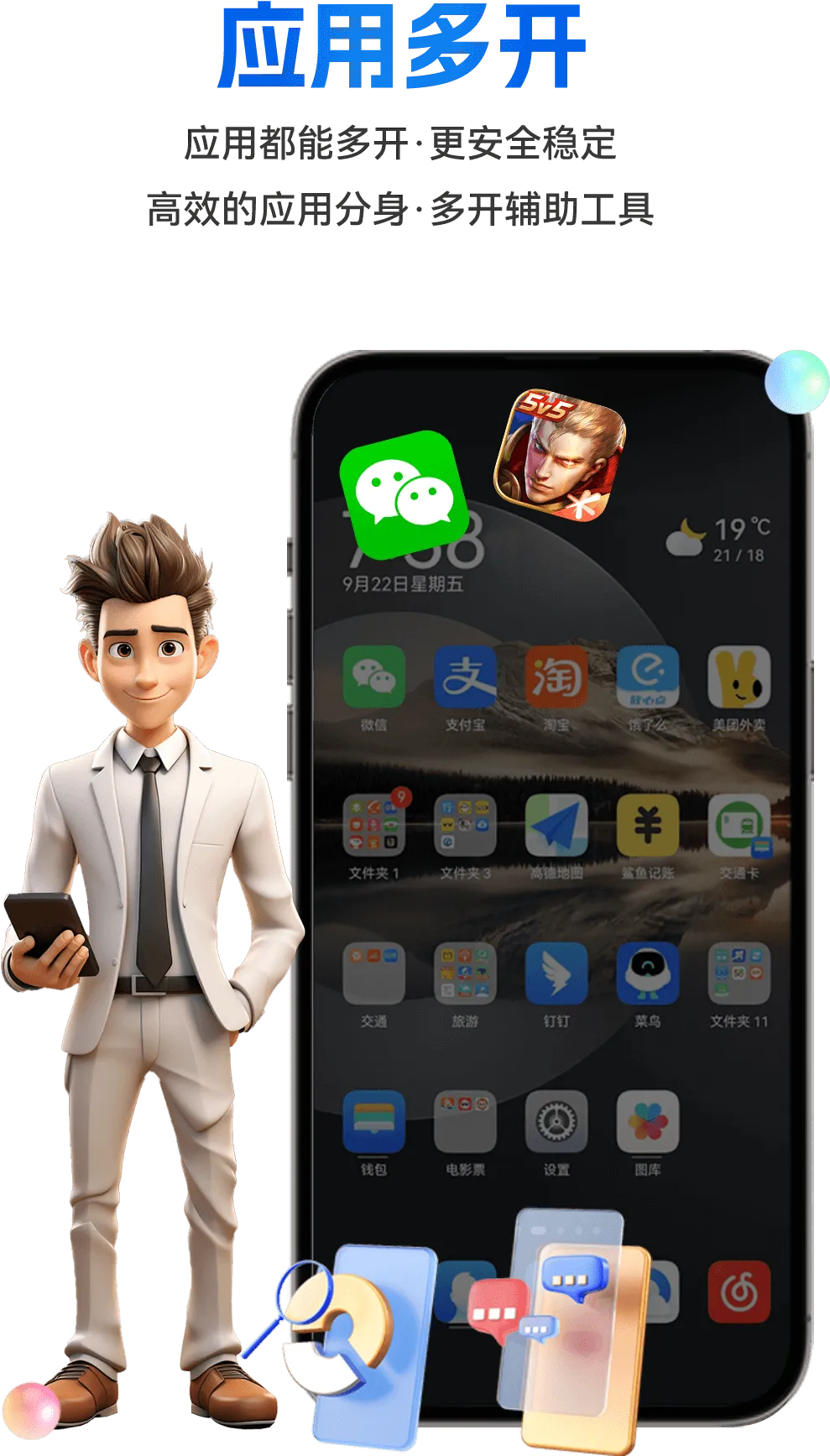 3、便捷畅玩:支持全天候云端运行各种app,游戏可24小时离线托管运行,无视地点一键虚拟定位,还能应用多开,且多平台兼容。