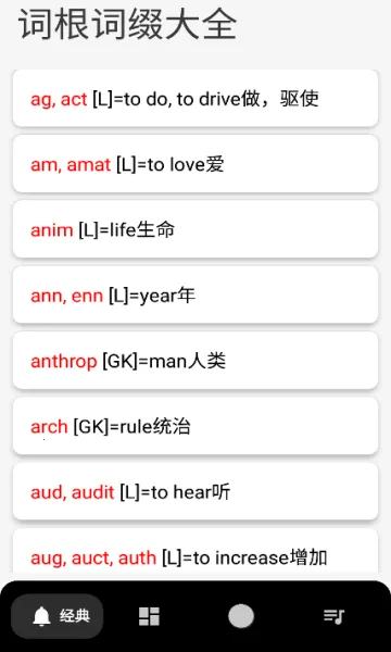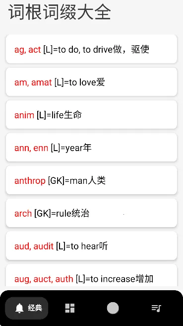 英语词根词缀字典是实用英语学习工具,覆盖词根词缀,有详细分析。界面极简,按词根分类助记单词,提供多种复习方式,还有详细解释、例句,结合记忆曲线,支持离线,助你轻松学英语、提升词汇量。