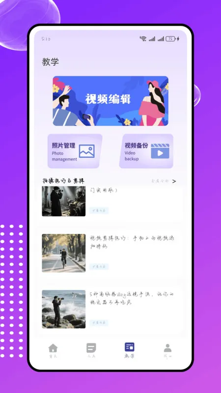 4、在教学页面中有照片管理、视频备份、还有拍摄技巧与剪辑。