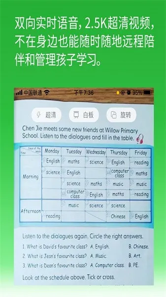 2. 亲子辅导超棒,有作业陪伴、高清图像传输,双向语音沟通顺畅,能在线答疑搜题。