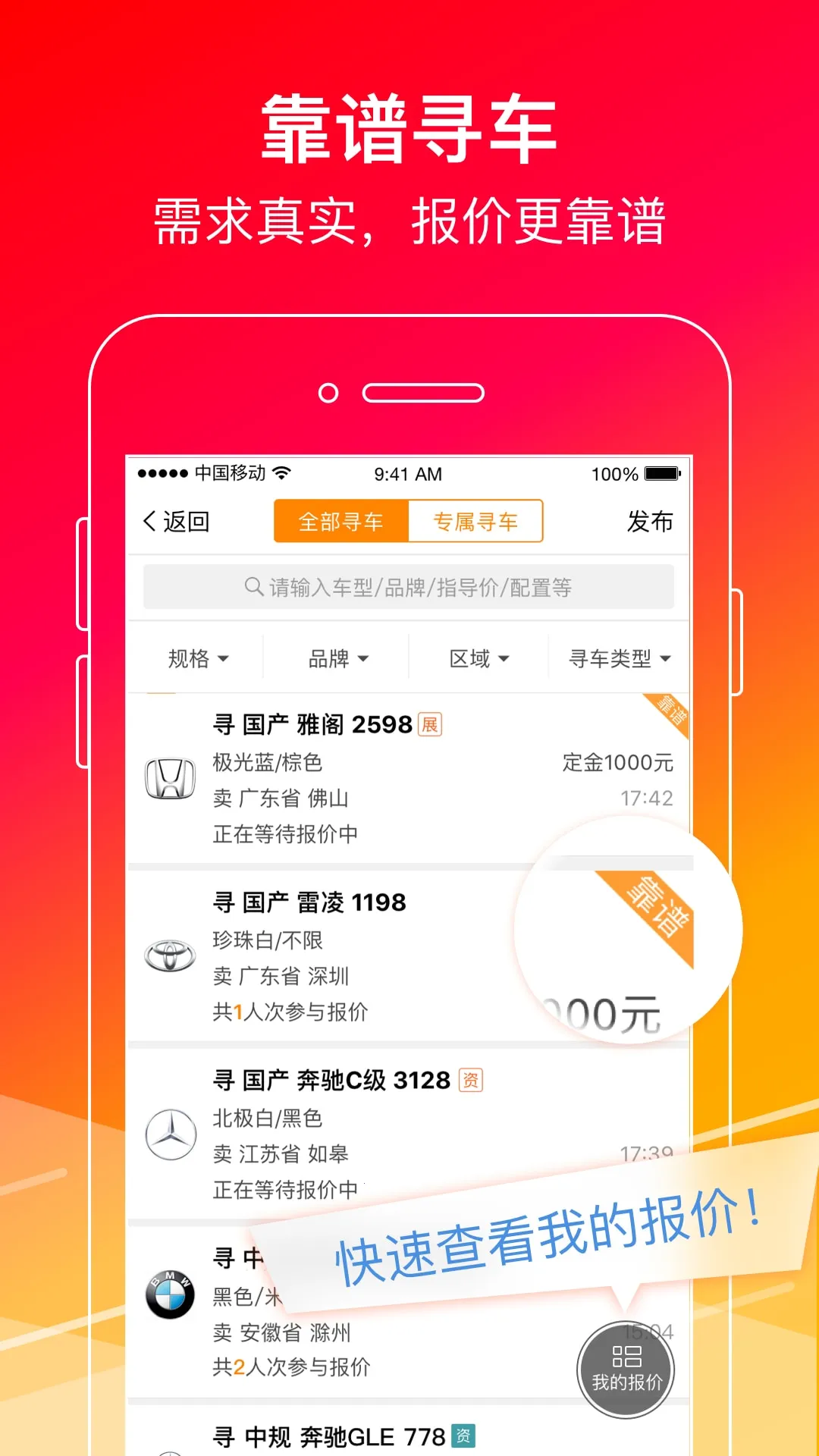 2. 寻车功能强大,信息推送及时,卖家可参与竞价报价,价格真实有效。