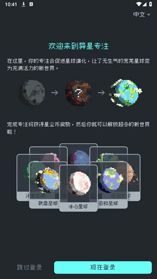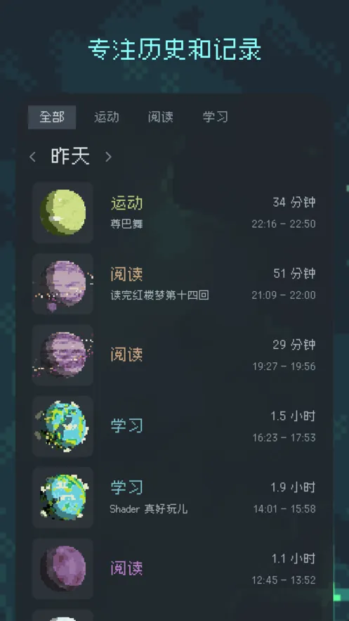 异星专注是一款独特的专注训练软件,将像素风格与游戏模式结合。提供多种计时模式,专注可得星尘币解锁星球种子,有收集合成、评价等功能。其统计功能助用户了解时间利用,有效提升专注力 。