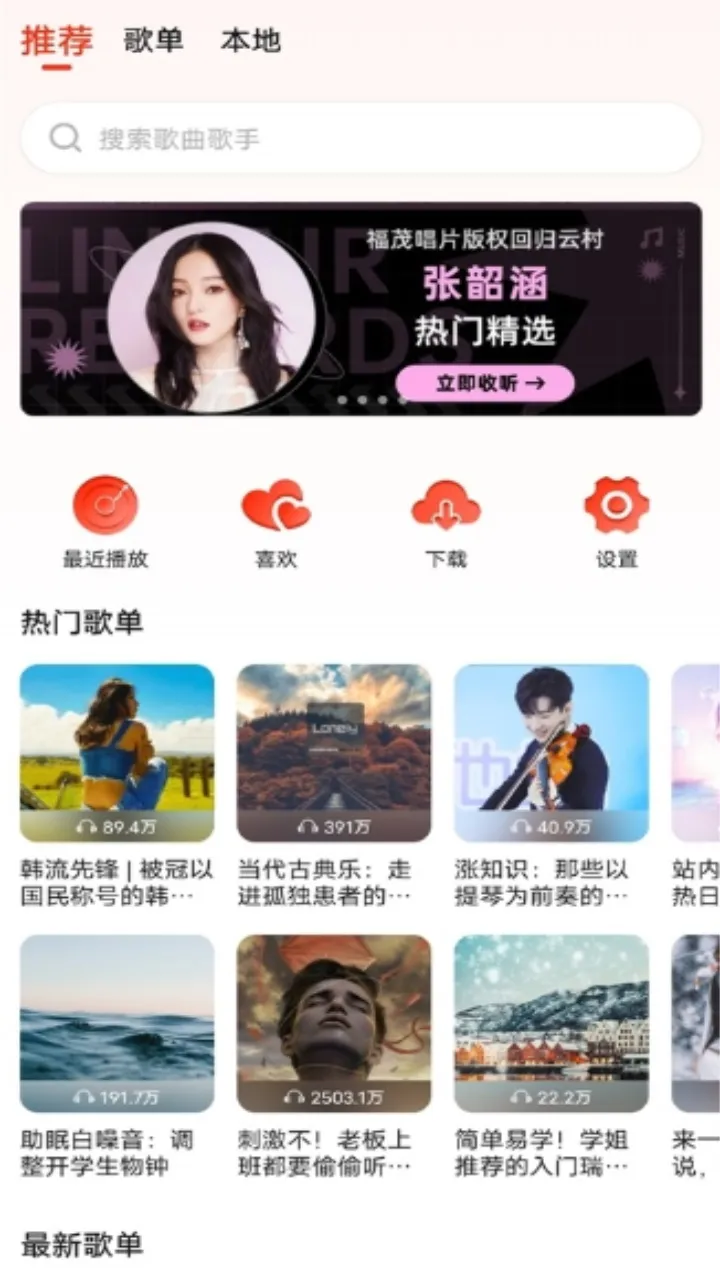 3、更新及时,最新音乐资源和艺人歌曲动态第一时间更新,还定期更新曲库,紧跟潮流。