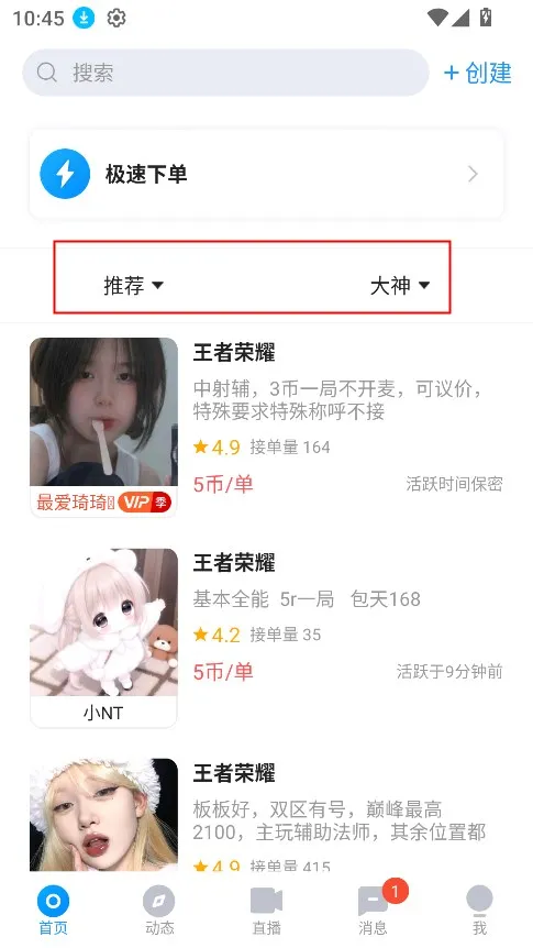 3、下单接单高效,用户能快速下单获取陪玩服务,游戏大神入驻平台可高效接单,增加收入来源,保障陪练服务质量。