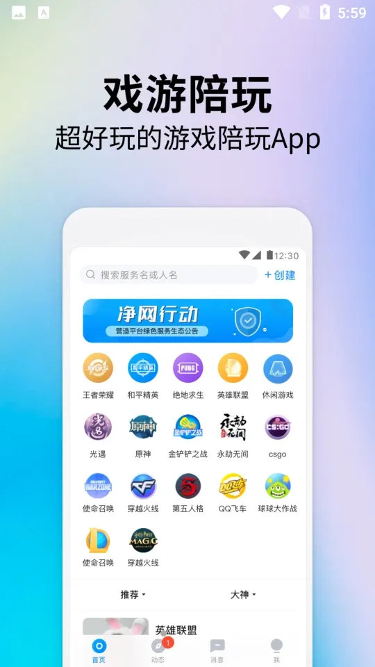 1、汇集大量游戏大神,涵盖王者荣耀、和平精英、英雄联盟等热门游戏领域,无论你想找何种游戏的陪玩都能满足。