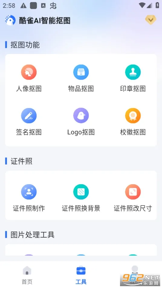酷雀AI智能抠图2025官方正版是实用的AI抠图修图软件。界面分四大板块,功能全。3秒自动识别主体,发丝级精准抠图。还能做证件照、修复老照片、无损放大等,无需PS,多场景适用 。