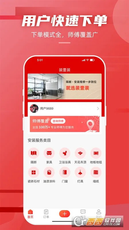 1、一站式工装服务,用户能轻松下单找合适师傅,师傅也可入驻自由接单,业务覆盖维修安装测量等多种服务。