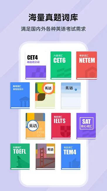 4、海量丰富词库:内置高考、四级、六级、考研、雅思、托福等经典英语单词词库,满足不同学习需求 。