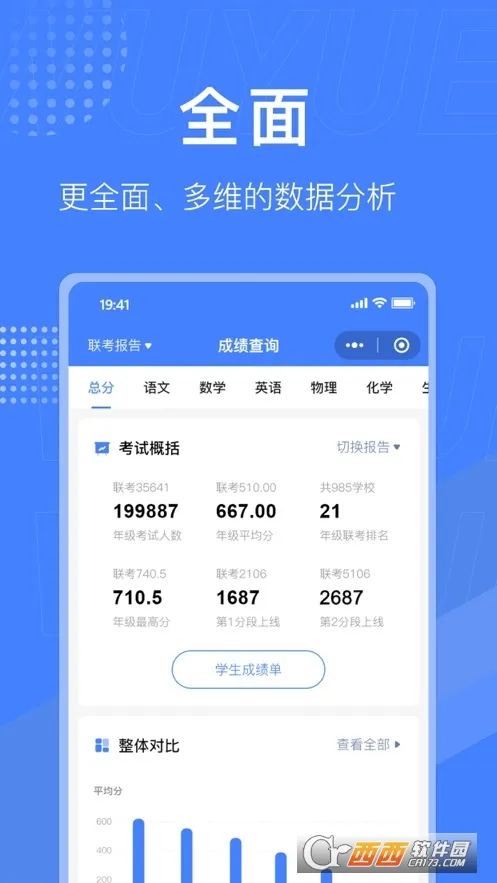 1、成绩查询便捷,每科成绩在线可查,考试概况详细记录,包括考试人数、平均分等。