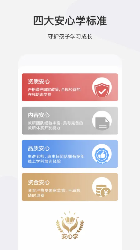 4、让人安心,资质上严格遵守国家政策合规经营;内容上教研体系完备;品质上教师经验丰富;资金受国家监管,不满意可随时退费。