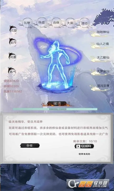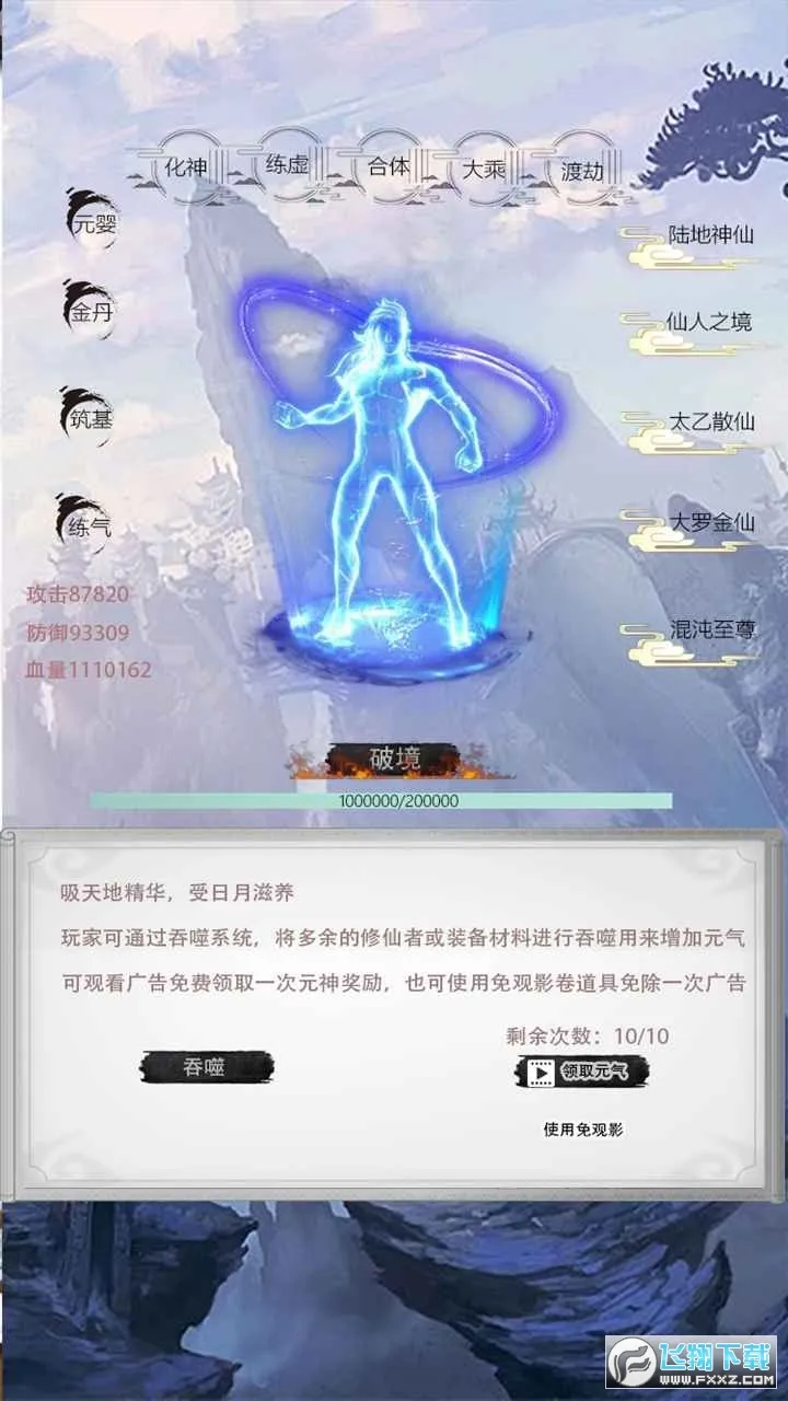 1、原创修仙设定,玩家从练气起步,逐步提升至陆地神仙,每次突破都有不同属性,实力随境界提升。