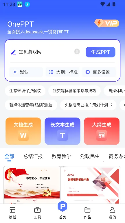 OnePPT是手机端AI智能生成演示文稿的软件。基于深度学习算法,输入主题关键词自动生成框架与内容,有海量模板、多格式转换、跨平台协作等功能,操作便捷,满足多类人群办公、教学等场景需求 。