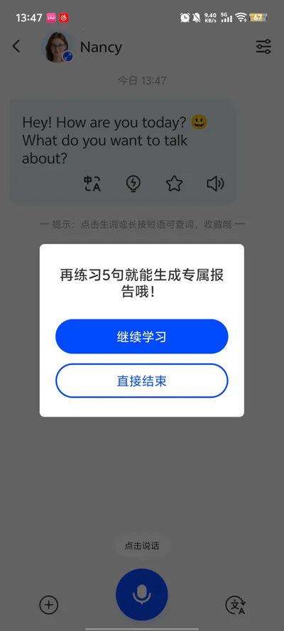 1、使用体验良好,按照教程,下载安装注册后即可开启练习。登录进入主页面,能依据自身水平挑选练习场景和匹配等级,发送语音对话后,可收到实时反馈及学习报告。