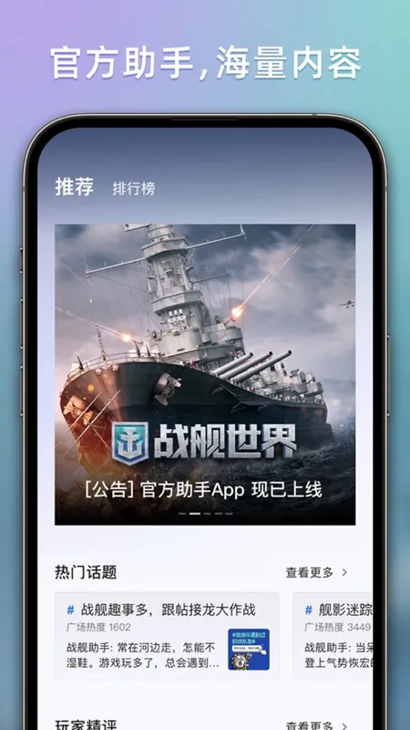 战舰助手是战舰世界官方打造的游戏助手,提供游戏资讯、数据动态等,支持玩家交流分享。具备发现、广场、百科、水表等功能模块,有战斗分析等亮点,服务器稳定,界面友好,能助玩家畅玩游戏。