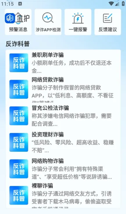 3、功能实用,不仅能自动检测手机安装软件是否存在诈骗风险,还提供丰富反诈科普内容,提升用户反诈意识。同时,用户察觉到诈骗可一键报警。