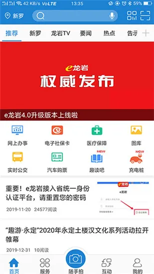 e龙岩App是龙岩市政府打造的公共服务平台,集信息服务、网上办事、政民互动和数字图书于一体。市民可掌握本地资讯,办理行政审批,查询医社保等,还可随手拍反映问题。