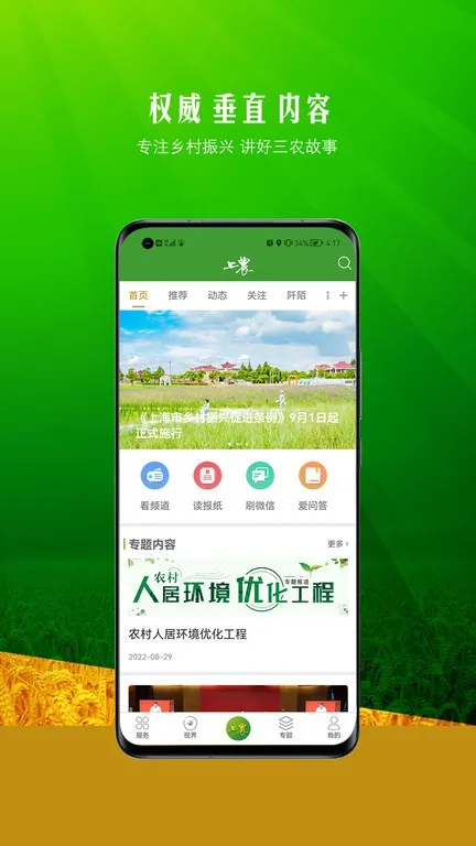 1、上农由东方城乡报社出品,是上海市农业农村委员会指定信息发布载体,能让人全方位了解上海乡村振兴和都市现代绿色农业发展,多角度品味上海风物和风土人情,感受浓浓乡愁。