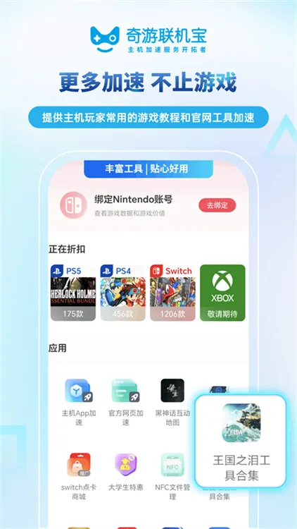 奇游联机宝app由成都俊云科技打造,支持PS5、Xbox、Switch等多平台上千款主机游戏。能解决卡顿延迟等问题,操作简单,一键加速,自动推送适配云节点,还可管理主机、监控网络,共享账号享多设备加速 。