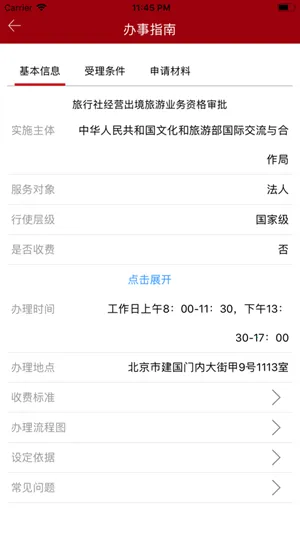 2、功能完整,能查询多项旅游相关信息,有详细名单,还能直观查看业务办理材料,政策法规实时更新。