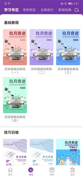 2、丰富曲库资源:拥有丰富多样的曲库,进行专区分类,如学习专区、考级专区等,可一键切换练习歌曲,能自动下发乐曲音色,还能选择不同演奏模式,如识谱、纠错、跟奏等,可自由调速、分手脚单独练习。