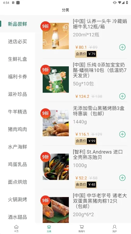 1、商品种类丰富,覆盖鸡鸭鱼牛羊猪肉、水产、蔬菜水果、冰淇淋、主食等冻品生鲜,还有进口水果、农村特产等,满足多样需求。