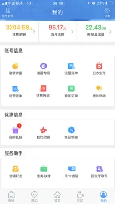 3、功能实用:具备账号信息查询,如套餐余量、话费账单等;优惠信息展示,像我的礼包、集团特惠;还有服务助手,可邀请好友、营业厅取号等。靓号、宽带、流量、漫游等专区也一应俱全。