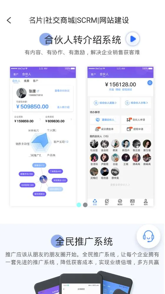 2、具备合伙人转介绍系统,低成本拓展销售渠道,解决获客难题。