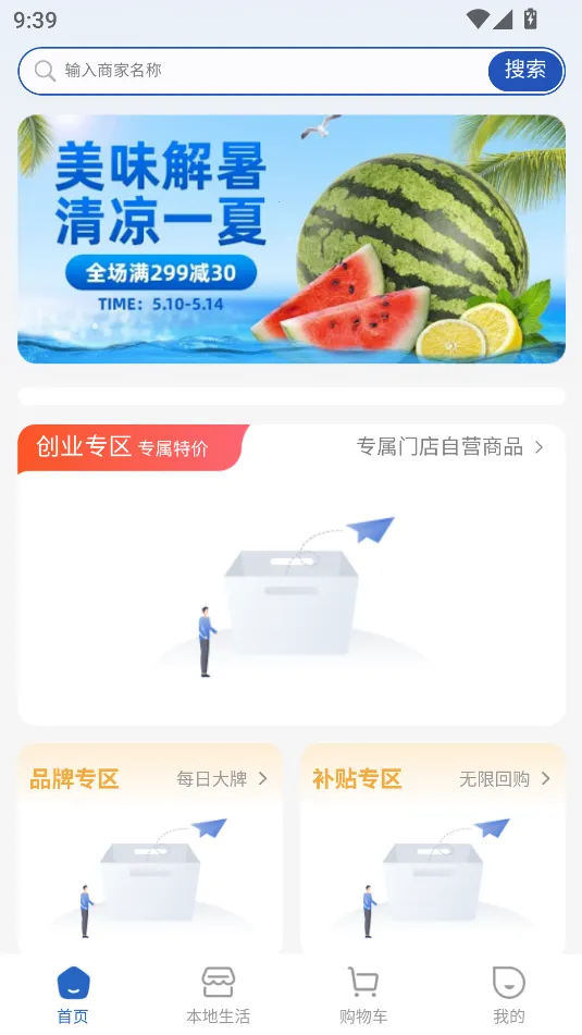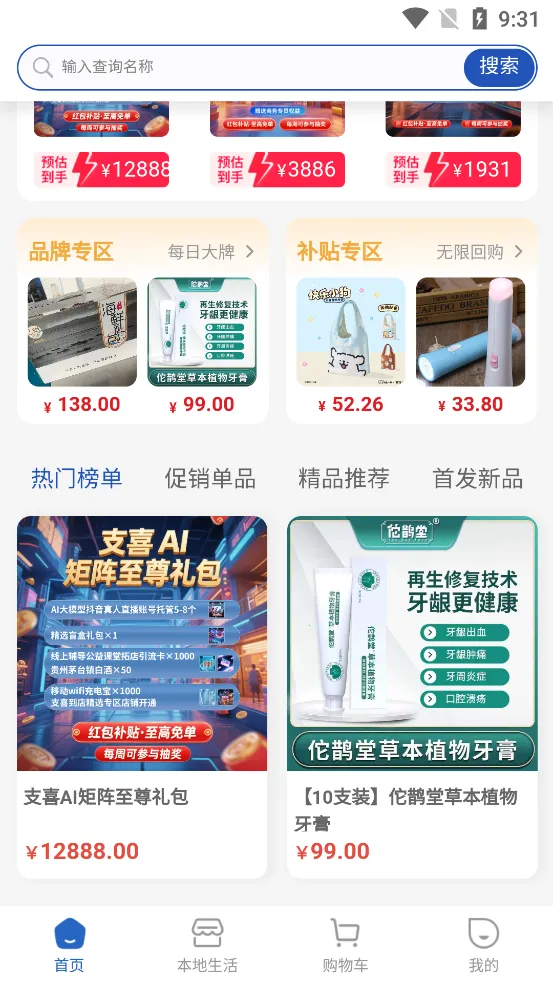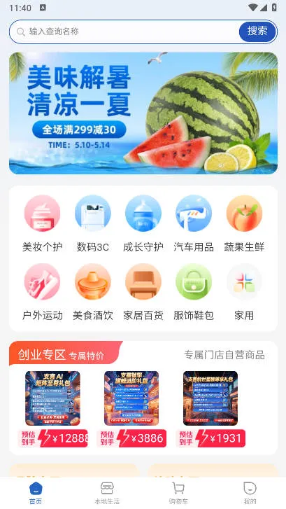 3、软件涵盖全品类商品,设置品牌专区等栏目,有满减秒杀等优惠,还整合30个高频生活场景,基于LBS定位推荐附近优质商家,支持线上下单线下核销。