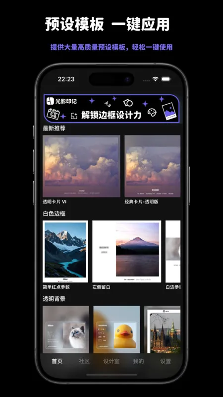 1、使用便捷,安装进入首页就能一键预览各类边框素材,社区页面展示最新拼图模板可供实时参考,设计室支持创建模板还有使用指南,完成登录在“我的”页面可查看个人修图作品。
