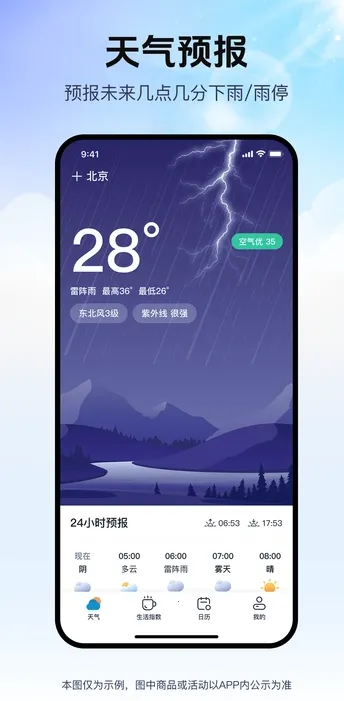 4、亮点颇多,提供多种生活指数服务,预报结果准确可靠,有日历功能,还能一键分享天气给亲友。此外,它以动画化展示天气,查询更有趣味。