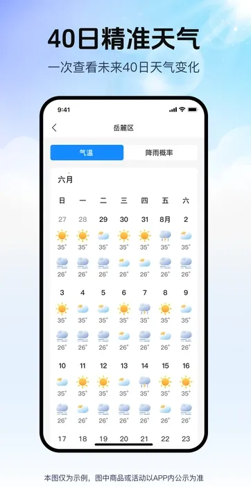 2、其操作方便,打开软件开启定位权限后,系统自动匹配当前城市,首页展示实时天气信息。点击可查看当日各时段温度曲线、未来40日天气走势,还能了解当天适合的活动。
