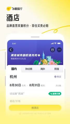 酒店预订服务很出色,有海量房型照片和真实评论,支持返现、信用住,还有首单专享大红包等优惠。