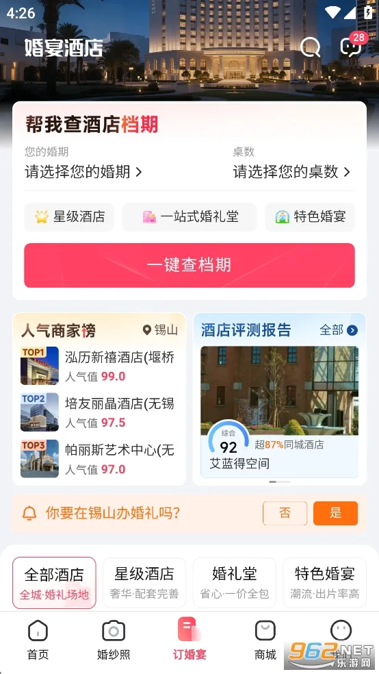 1、一站式服务:集成婚宴预定、婚纱摄影、婚礼策划、婚纱礼服、珠宝钻戒、婚房布置、婚车租赁、喜糖请帖等全部内容,一个 app 就能满足所有婚礼相关服务需求,无需四处寻找资源。