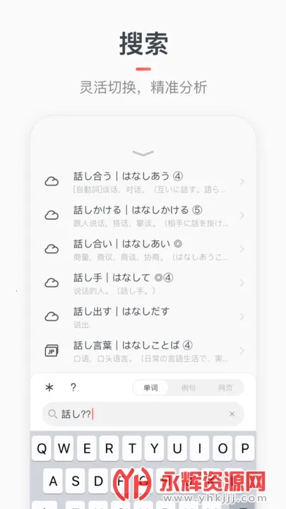 2、搜索精准高效:支持中日英混合快速精准搜索,根据用户输入的中日假名、罗马拼音以及英文,自动快速检索词条并提供云端高精度预测结果,还能实时获取云端预测搜索结果。